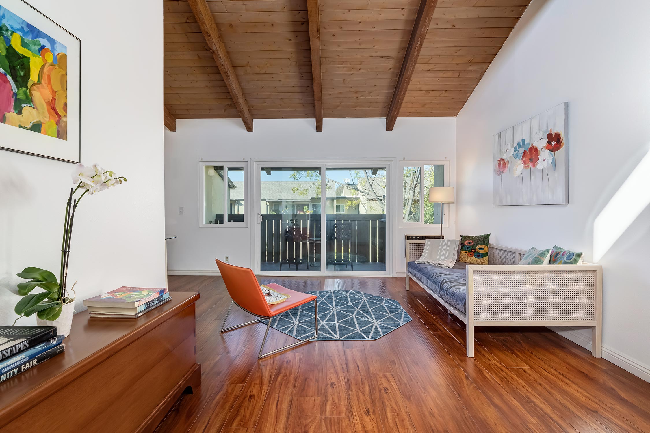 This beautiful light and bright two bedroom one bathroom condo features a vaulted wooden beamed ceiling, sky light, a tastefully updated kitchen, a refreshed bathroom and ample closet space. The spacious living and dining areas open to a large private balcony, surrounded by the treetops. This unit is located in a quiet and serene section of the Tara Hill Complex which includes a guard gated entrance, 24 hour security, 2 pools, a wading pool, spa, saunas, a club house, a fitness center, a playground, and laundry facilities. Also included are two assigned, covered tandem parking spaces. Located in the award winning Culver City school district and conveniently located minutes from downtown Culver City, restaurants, retail shops.